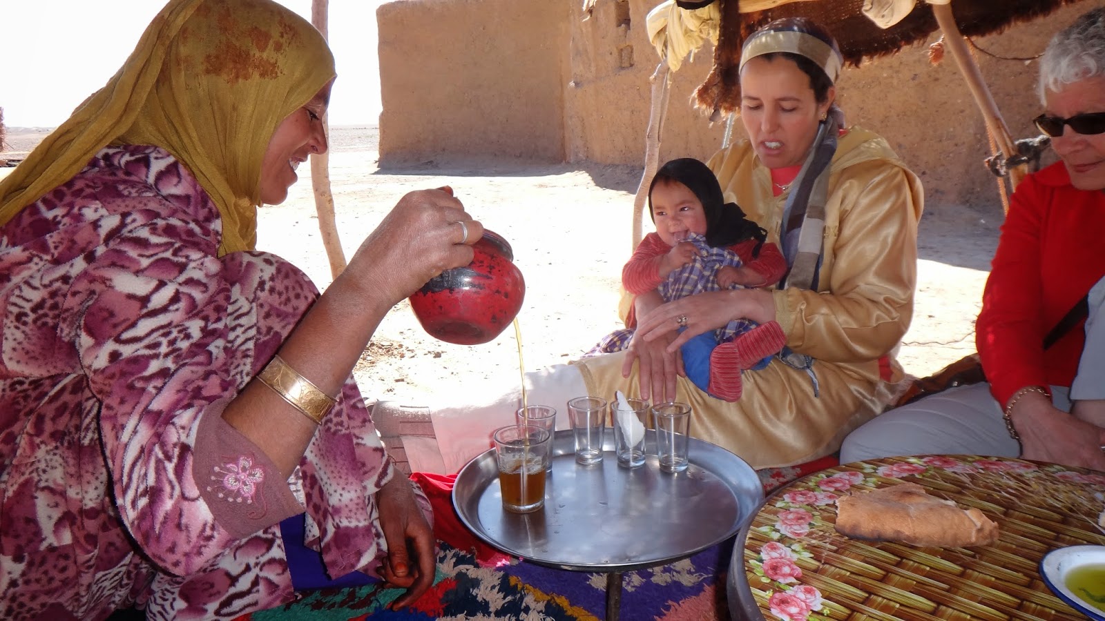 Elle confie le bébé qu'elle avait aux bras à Aïcha et va chercher une table basse qu'elle installe sous la tente pour y déposer à notre intention les éléments traditionnels de bienvenue, à savoir, une soucoupe d'huile d'olive, un pain qu'elle à partagé de ses mains en 4 morceaux.et bien sur le thé à la menthe.